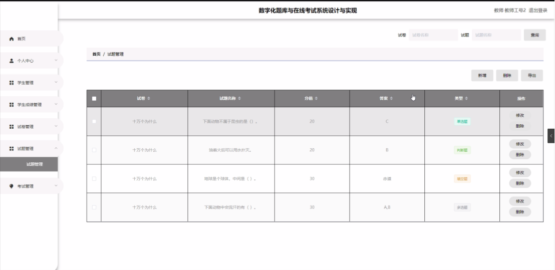 教师点击试题管理。在试题页面输入试卷名称和试题名称进行查询、新增、删除或导出试题列表,并根据需要对试题详情信息进行修改或删除操作;如图5-14所示: