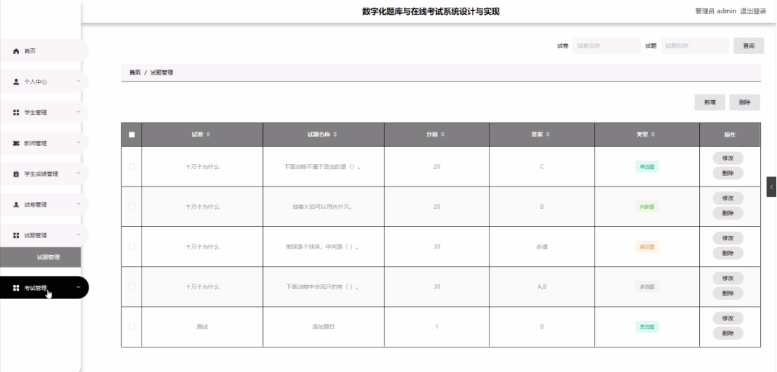 管理员点击试题管理。在试题页面输入试卷名称和试题名称进行查询、新增或删除试题列表,并根据需要对试题详情信息进行修改或删除操作;如图5-8所示: