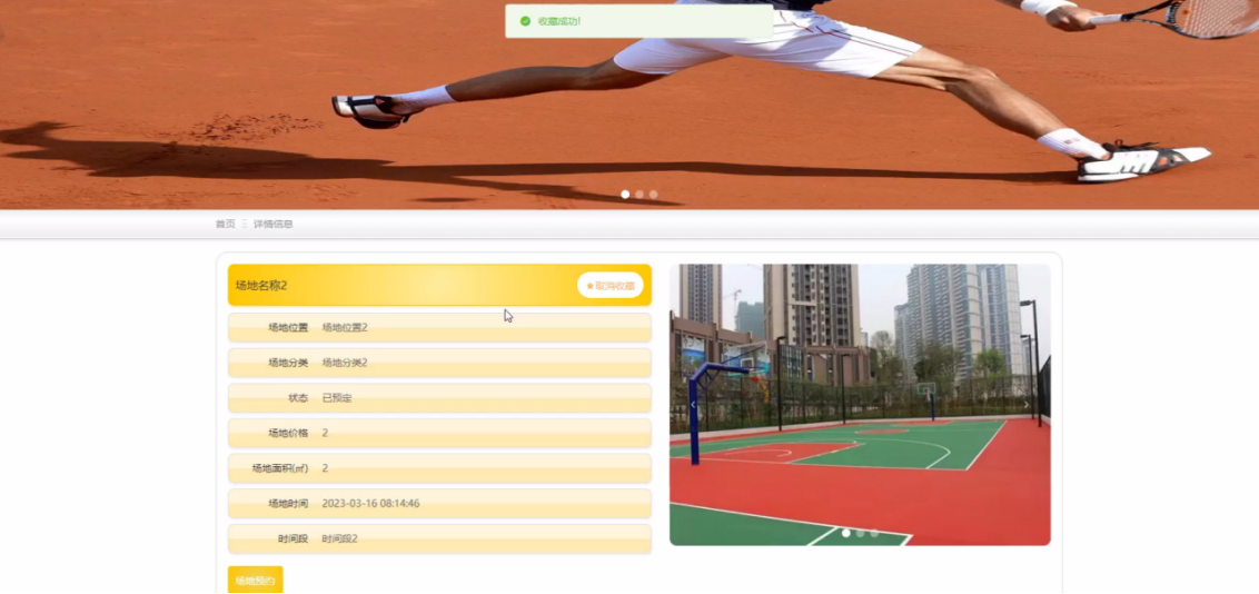 球类场地,用户可在球类场地页面查看场地名称、场地图片、场地分类、状态、场地价格、场地面积、场地时间、时间段等内容,还可进行预约或收藏等操作,页面如图5-3所示: