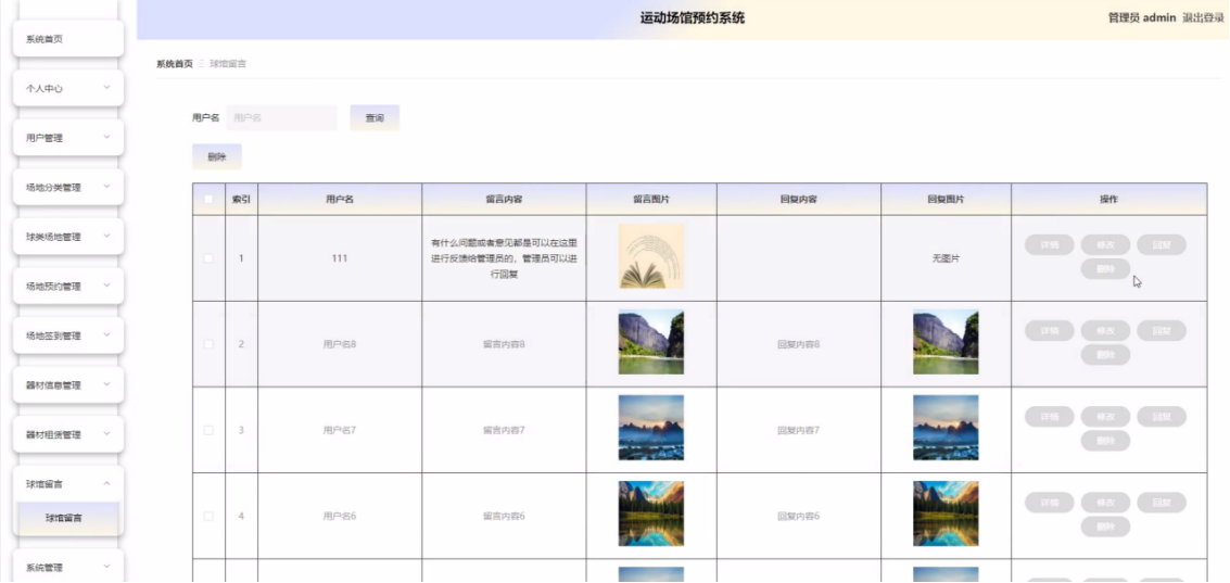 场馆留言管理,管理员可在场馆留言管理页面查看用户名、留言内容、留言图片、回复内容、回复图片等内容,还可进行回复、修改或删除等操作,如图5-15所示: