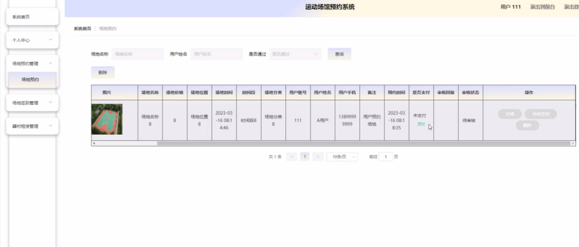 场地预约管理,用户可在场地预约管理页面查看图片、场地名称、场地价格、场地位置、场地时间、时间段、场地分类、用户账号、用户姓名、用户手机、备注、预约时间、是否支付、审核回复、审核状态等内容,还可进行删除等操作,如图5-7所示。