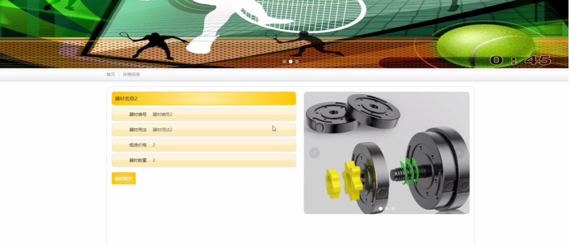器材信息,用户可在器材信息页面查看器材名称、器材图片、器材编号、器材用法、租赁价格、器材数量等内容,还可进行租赁等操作,如图5-4所示: