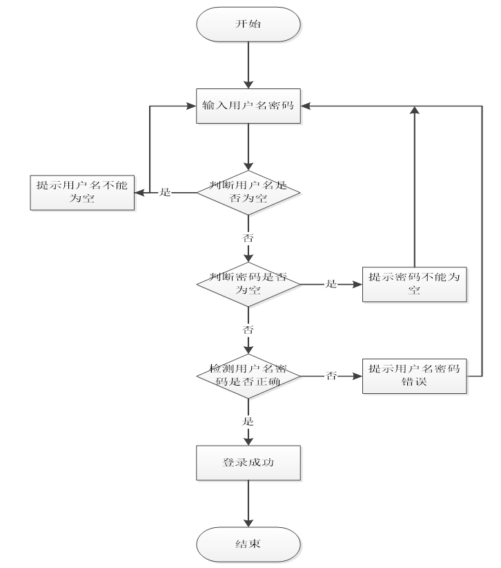 首先为系统登录页面。进入页面后,用户可进行登录和注册的操作。点击登录后,页面就会出现一个登录提示框,向用户传达信息:要进行用户名和密码的输入,完成后才可以进行下一步的操作。用户输入完成后,系统会将输入的信息提交给后台,与数据库中的信息记录进行比较判断。判断比较内容主要分为三个方面:从用户名是否为空、输入的密码是否为空、用户名和密码是否匹配三方面进行判断。只有上述三个条件同时满足,数据库中的信息匹配正确,才视为登陆成功,方可完成后续的操作。若以上三种情况有一条不满足,则会提示该次登录错误,就需要进行重新登录。系统登录流程图如图3-1所示: