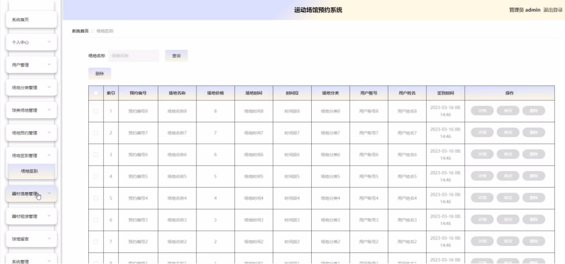 场地签到管理,管理员可在场地签到管理页面查看预约编号、场地名称、场地价格、场地时间、时间段、场地分类、用户账号、用户姓名、签到时间等内容,还可进行修改或删除等操作,如图5-12所示: