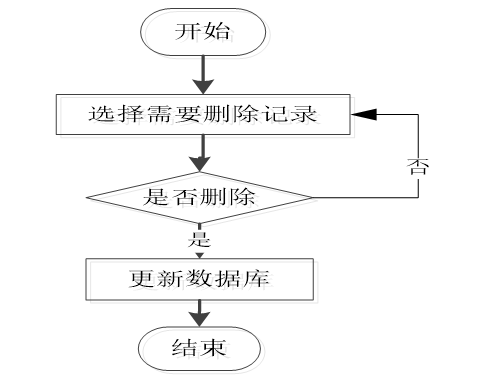 最后为删除信息页面。进入该页面后,用户可以对所要删除的信息进行选择,选择好删除的内容后,会有一个“是否确认删除”的提示框,操作者可以根据自己的意愿来选择“是”或“否”。完成上述操作,系统会自动的对删除的内容进行判断,如果符合删除要求则会成功删除数据记录,并且更新数据库的内容信息;如果删除的数据记录不符合要求,则会有一个“删除失败”的提示框,操作人员需要根据提示来进行修改,修改完成后重新删除知道删除成功。删除信息流程图如图3-3所示: