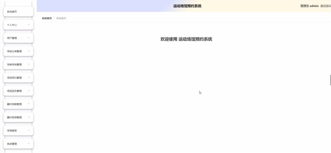 管理员通过登录进入系统可查看个人中心、用户管理、场地分类管理、球类场地管理、场地预约管理、场地签到管理、器材信息管理、器材租赁管理、球馆留言、系统管理等内容,如图5-9所示: