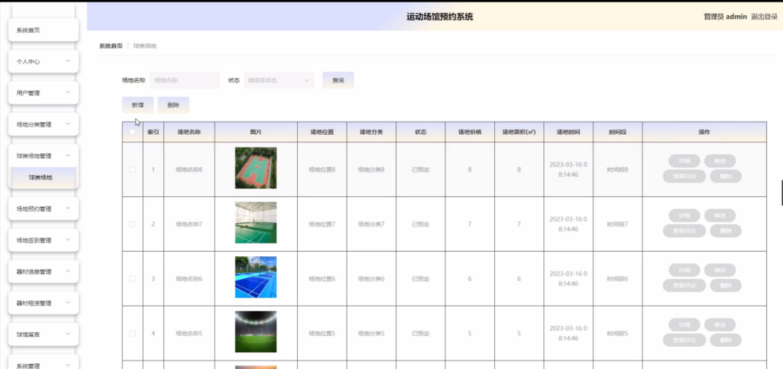 球类场地管理,管理员可在球类场地管理页面查看场地名称、图片、场地位置、场地分类、状态、场地价格、场地面积、场地时间、时间段等内容,还可进行新增、修改、查看评论或删除等操作,如图5-11所示: