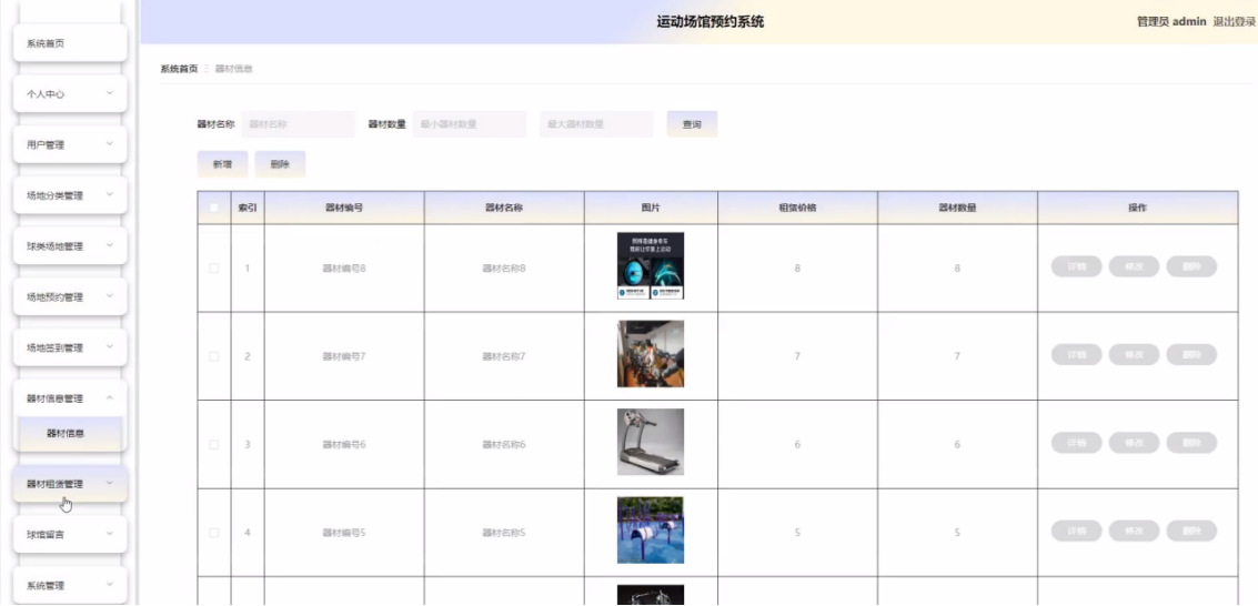 器材信息管理,管理员可在器材信息管理页面查看器材编号、器材名称、图片、租赁价格、器材数量等内容,还可进行新增、修改或删除等操作,如图5-13所示: