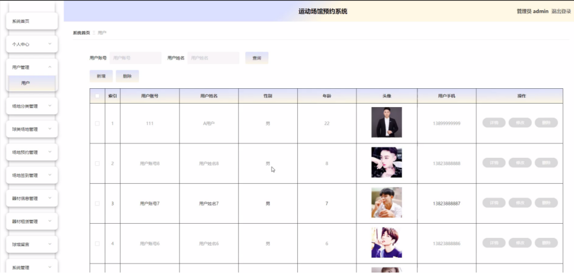 用户管理,管理员可在用户管理页面查看用户账号、用户姓名、性别、年龄、头像、用户手机等内容,还可进行新增、修改或删除等操作,如图5-10所示: