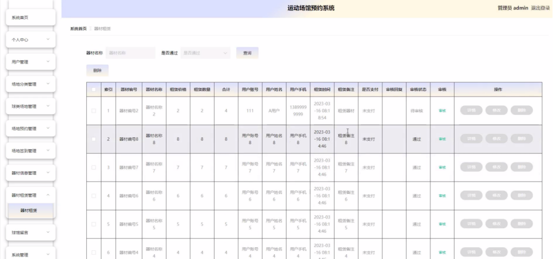 器材租赁管理,管理员可在器材租赁管理页面查看器材编号、器材名称、租赁价格、租赁数量、合计、用户账号、用户姓名、用户手机、租赁时间、租赁备注、是否支付、审核回复、审核状态等内容,还可进行审核、修改或删除等操作,如图5-14所示。