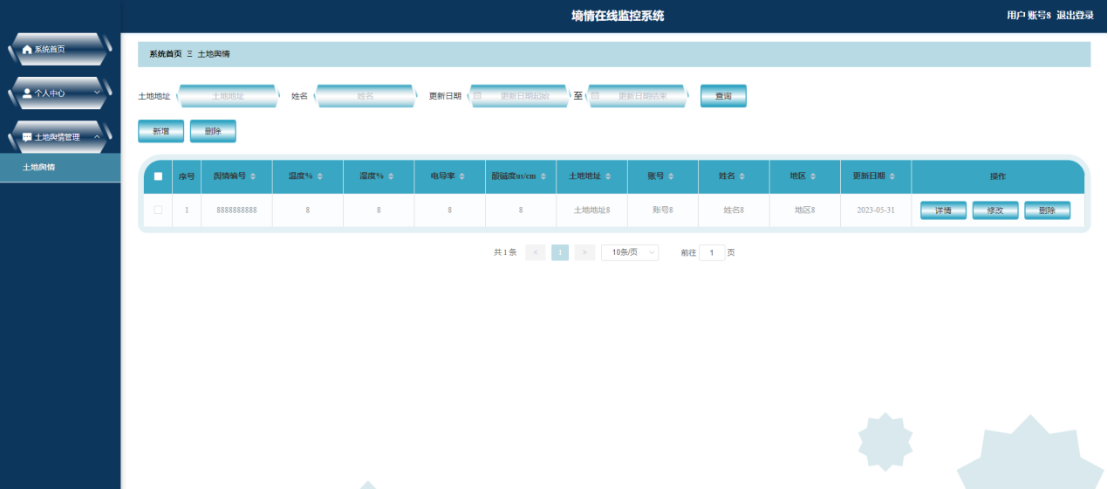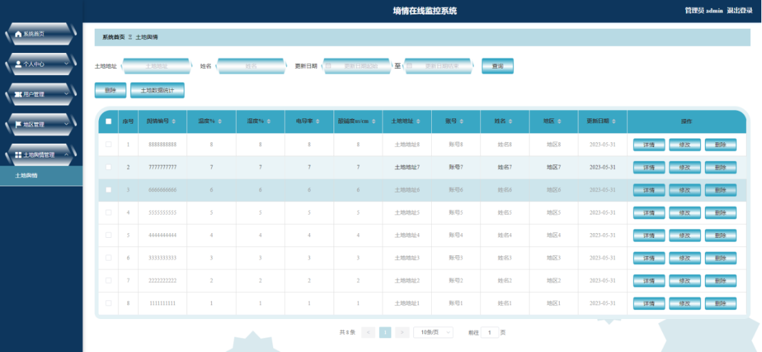 土地舆情管理(温度、湿度、电导率、酸碱度、地址、更新日期)