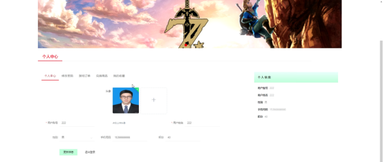 个人中心:在个人中心页面可以对个人中心、修改密码、游戏订单、兑换商品、我的收藏进行详细操作;如图5-6所示: