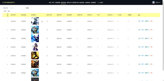 • 游戏信息:名称、类型、图片、下载地址、角色名称/等级、出售价格、交易方式、详情、积分、发布时间、点击/收藏/评论量