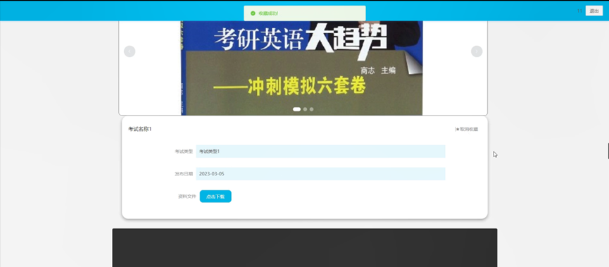 考试资料:在考试资料页面的输入栏中输入考试名称和考试类型进行查询,可以查看到考试资料详细信息,并进行收藏操作,考试资料页面如图5-4所示: