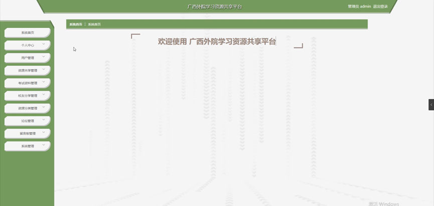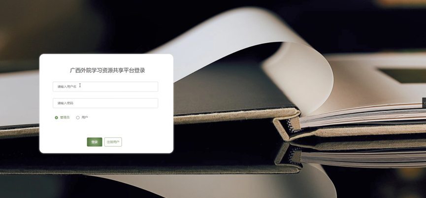广西外院学习资源共享平台分两大部分,即管理员管理和用户管理。系统按照用户的实际需求开发而来,贴近生活。从管理员出拿到分配好的账号密码可以进入系统,使用相关的系统应用。管理员总体负责整体系统的运行维护,统筹协调。