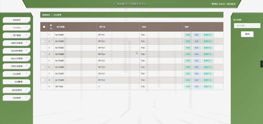 管理员点击论坛管理。在论坛页面输入帖子标题进行查询论坛列表,并根据需要对论坛详情信息进行详情、修改或查看评论操作;如图5-14所示:
