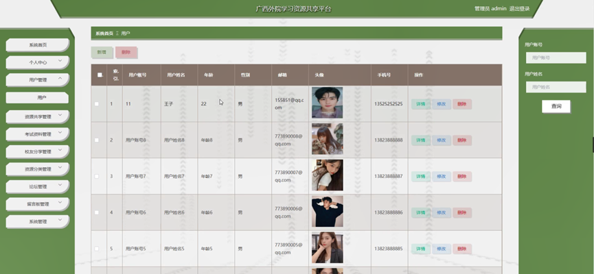 广西外院学习资源共享平台主要有管理员和用户两个功能模块。以下将对这两个功能的作用进行详细的剖析。