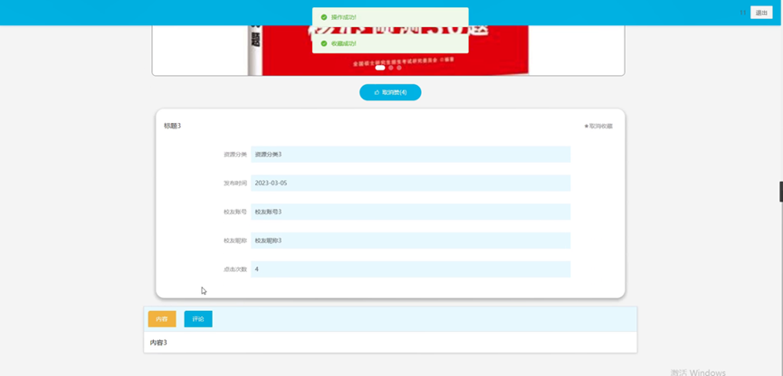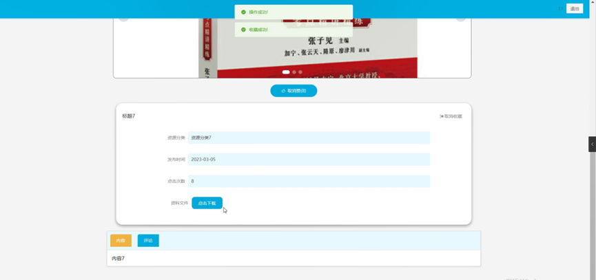 资源共享:在资源共享页面的输入栏中输入标题进行查询,可以查看到资源共享详细信息,并根据需要进行评论或收藏操作;资源共享页面如图5-3所示: