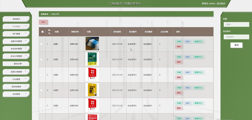 管理员点击校友分享管理。在校友分享页面输入标题和校友账号进行查询或删除校友分享列表,并根据需要对校友分享详情信息进行详情、修改、查看评论或删除操作;如图5-13所示: