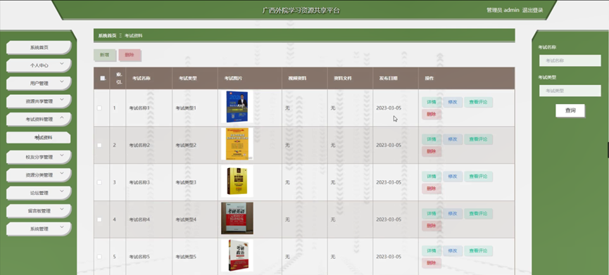 管理员点击考试资料管理。在考试资料页面输入考试名称和考试类型进行查询、新增或删除考试资料列表,并根据需要对考试资料详情信息进行详情、修改、查看评论或删除操作;如图5-12所示: