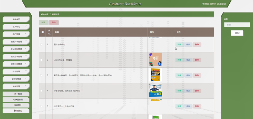 管理员点击系统管理,在新闻资讯页面输入标题可以查询,新增或删除新闻资讯列表,并根据需要对新闻资讯详细信息进行查看详情,修改或删除操作,还可以对关于我们、轮播图管理和系统简介进行详细操作。如图5-15所示: