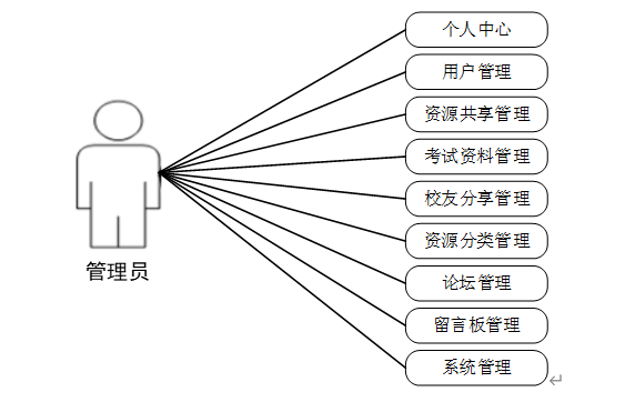 管理员模块:管理员是系统中的核心用户,管理员登录后,可以对后台系统进行管理。主要功能有个人中心、用户管理、资源共享管理、考试资料管理、校友分享管理、资源分类管理、论坛管理、留言板管理、系统管理等功能。管理员用例如图3-1所示。