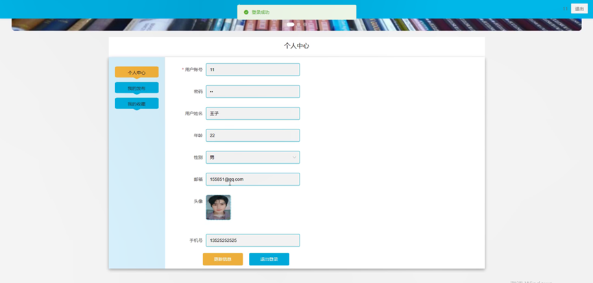 个人中心:在个人中心页面输入个人信息可以进行更新操作,并根据需要对我的发布和我的收藏进行详细操作;如图5-7所示: