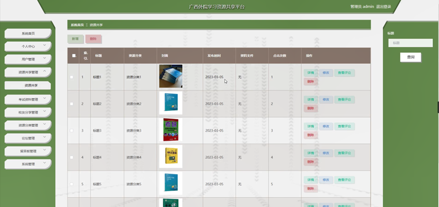 管理员点击资源共享管理。在资源共享页面输入标题进行查询、新增或删除资源共享列表,并根据需要对资源共享详情信息进行详情、修改、查看评论或删除操作;如图5-11所示: