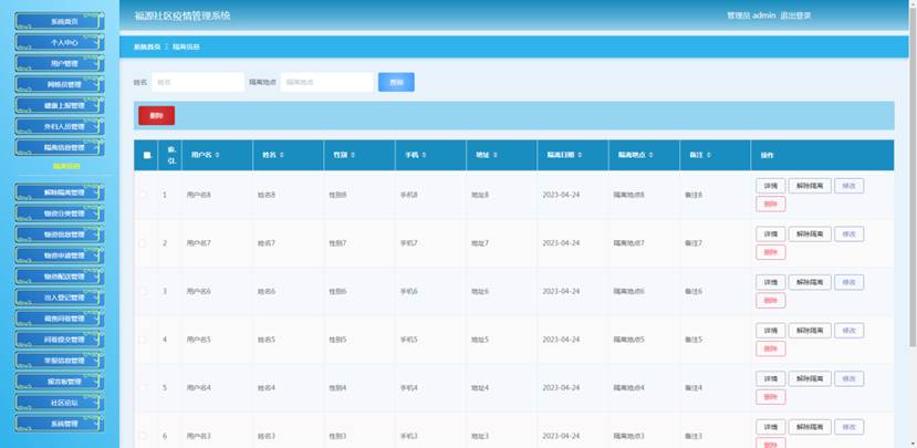 管理员点击隔离信息管理。进入隔离信息页面输入姓名,隔离地点可以查询或删除隔离信息列表,并根据需要对隔离信息进行详情,解除隔离、修改或删除操作。如图5-9所示: