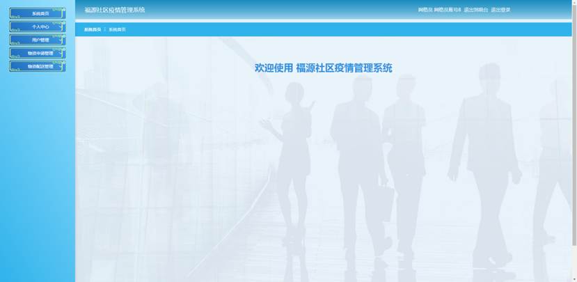 网格员进入系统可以对首页,个人中心,用户管理,物资申请管理,物资配送管理等功能进行操作。网格员主界面如图5-12所示: