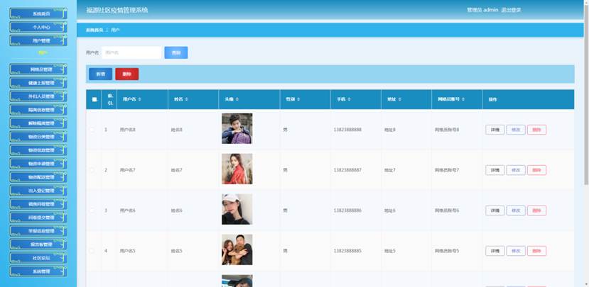 管理员点击用户管理。进入用户页面输入用户名可以查询、新增或删除用户列表,并根据需要对用户详细信息进行查看详情,修改和删除等操作。如图5-7所示: