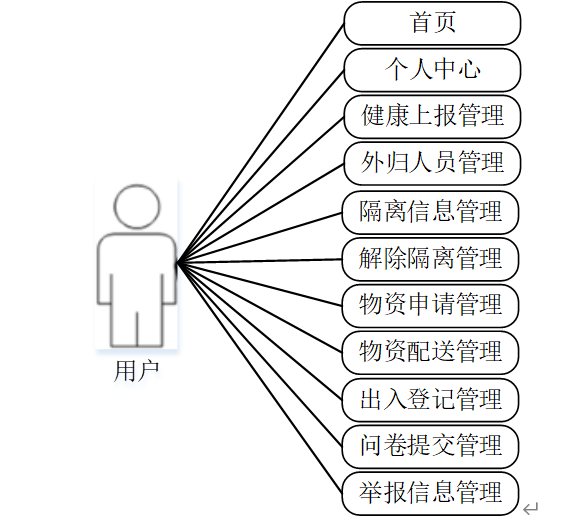 (3) 用户进入系统可以对首页,个人中心,健康上报管理,外归人员管理,隔离信息管理,解除隔离管理,物资申请管理,物资配送管理,出入登记管理,问卷提交管理,举报信息管理等功能进行操作,用例分析如图3-3所示。