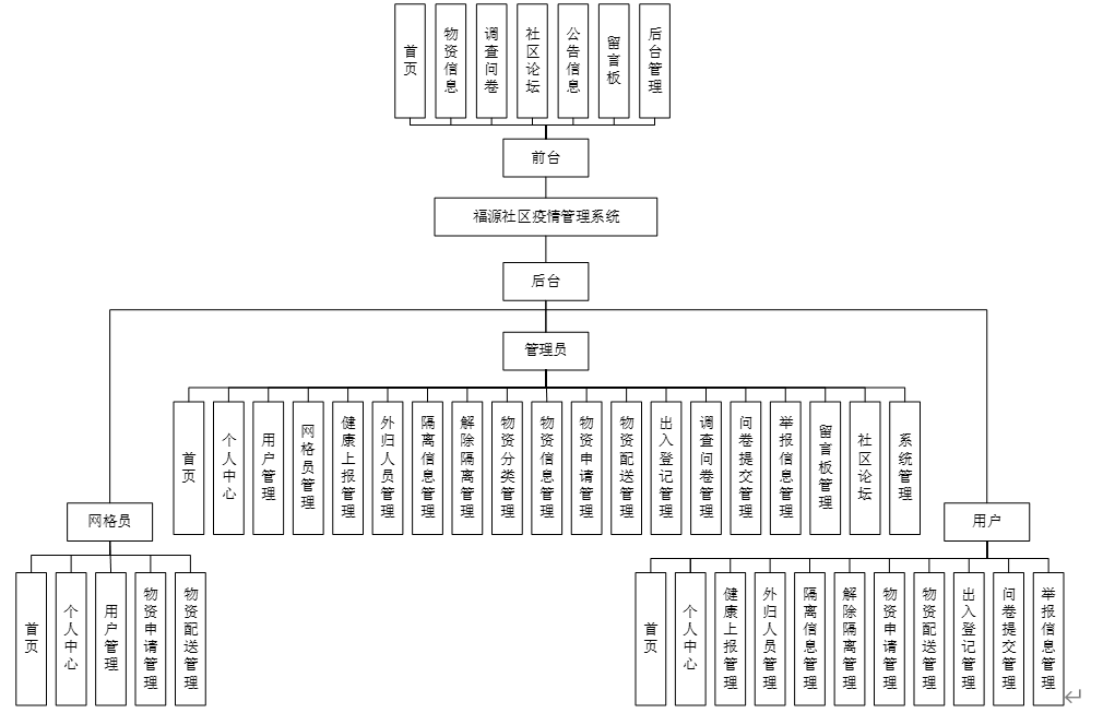 系统的建设可以为福源社区疫情管理提供帮助,通过对一些基础信息管理实现针对性的安排,可以按照用户的角色权限使不同用户角色看到不一样的信息界面。现根据需求阶段的分析,我们可以大致确定系统需要包含的功能如下图所示:
