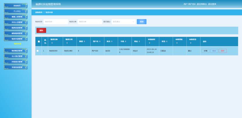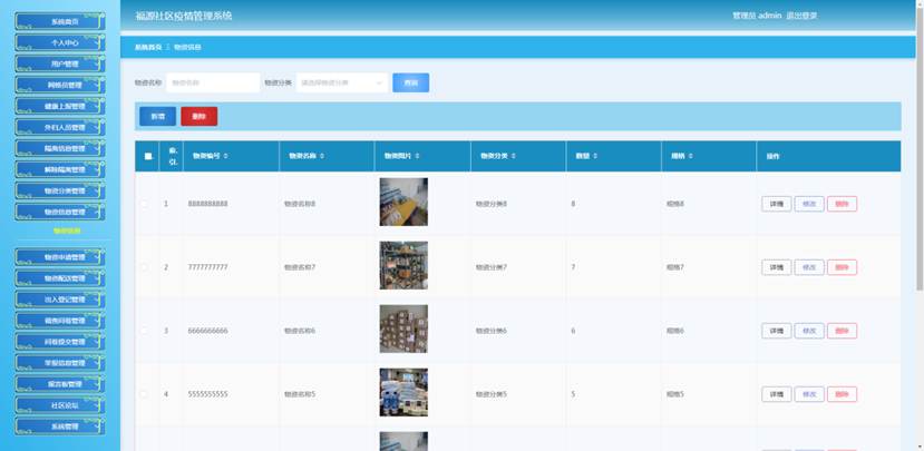 管理员点击物资信息管理。进入物资信息页面输入物资名称,物资分类可以查询、新增或删除物资信息列表,并根据需要对物资信息进行详情,修改或删除操作。如图5-10所示: