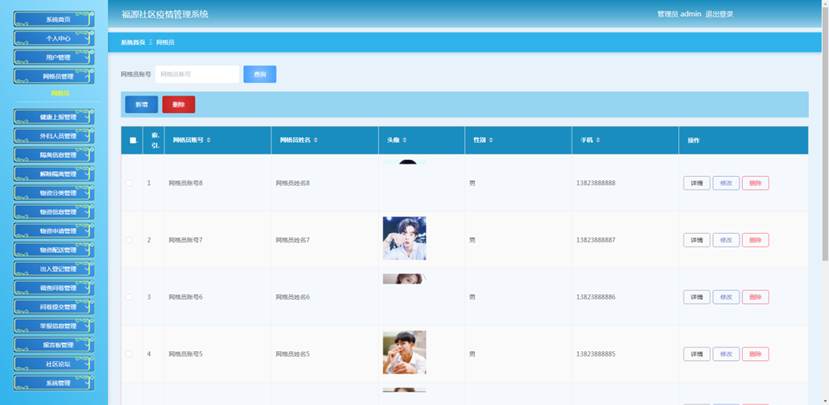 管理员点击网格员管理。进入网格员页面输入网格员账号可以查询、新增或删除网格员列表,并根据需要对网格员进行查看详情,修改和删除等操作。如图5-6所示: