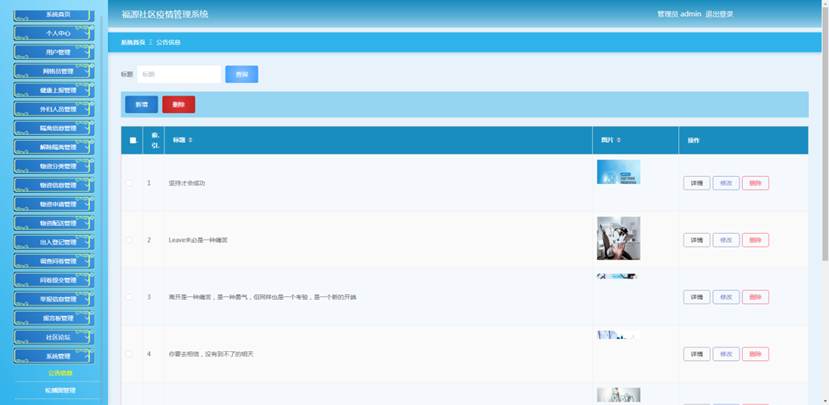 管理员点击系统管理,进入公告信息页面输入标题可以查询、新增或删除公告信息列表,并根据需要对可以对公告信息进行详情、修改或删除操作,还可以对轮播图管理进行详细操作。如图5-11所示: