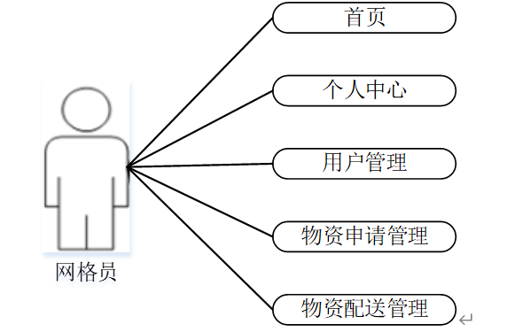 (4) 网格员进入系统可以对首页,个人中心,用户管理,物资申请管理,物资配送管理等功能进行操作,用例分析如图3-4所示。