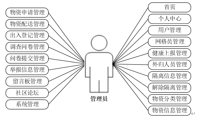(2)管理员可以对首页,个人中心,用户管理,网格员管理,健康上报管理,外归人员管理,隔离信息管理,解除隔离管理,物资分类管理,物资信息管理,物资申请管理,物资配送管理,出入登记管理,调查问卷管理,问卷提交管理,举报信息管理,留言板管理,社区论坛,系统管理等进行基本的信息管理。其用例分析如图3-2所示。