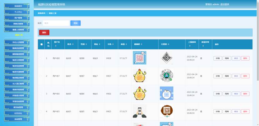 管理员点击健康上报管理。进入健康上报页面输入姓名可以查询或删除健康上报列表,并根据需要对健康上报信息进行查看详情,隔离、修改或删除操作。如图5-8所示: