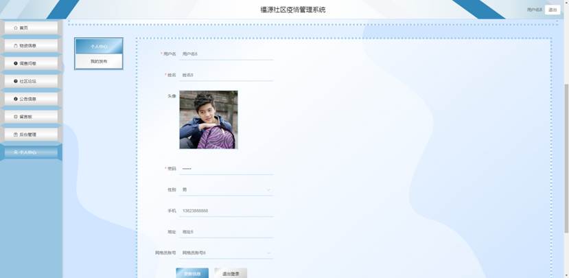 个人中心:在个人中心页面输入个人信息可以进行更新操作;还可以对我的发布进行详细操作;如图5-3所示: