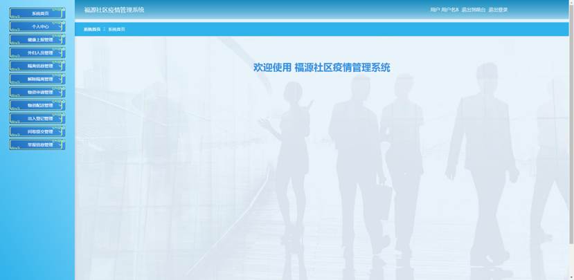 用户进入系统后台可以对首页,个人中心,健康上报管理,外归人员管理,隔离信息管理,解除隔离管理,物资申请管理,物资配送管理,出入登记管理,问卷提交管理,举报信息管理等功能进行操作。用户主界面如图5-13所示: