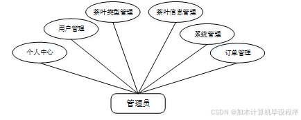 (3)管理员通过系统对可以实现网站系统管理,主要包括个人中心、用户管理、茶叶类型管理、茶叶信息管理、系统管理、订单管理等功能。管理员用例图如图3-3所示。