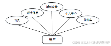 (2)用户可以实现首页、茶叶信息、活动公告、个人中心、购物车等,用户用例图如图3-2所示。