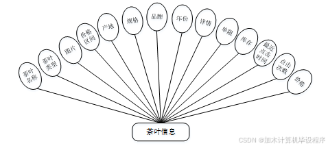 茶叶信息实体包括茶叶名称、茶叶类型、图片、价格区间、产地、规格、品牌、年份、详情、单限、库存、最近点击时间、点击次数、价格等属性。茶叶信息实体图如图4-2所示:
