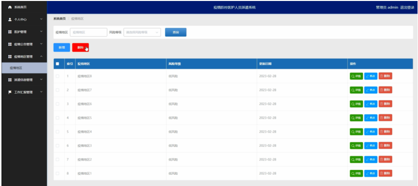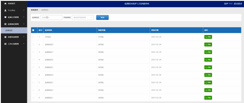 疫情地区管理:系统支持对疫情地区的风险等级进行分类和管理,医护人员可以查看不同地区的疫情情况,为派遣决策提供依据。