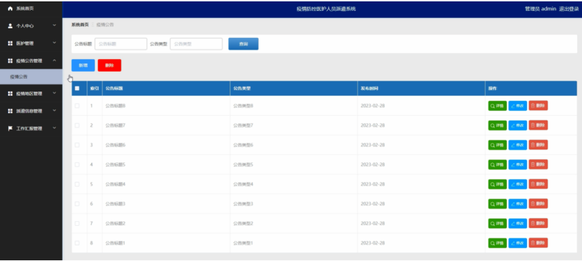 疫情公告管理:管理员可以发布和更新疫情公告,医护人员可以实时查看最新的疫情动态,以便更好地了解疫情防控的最新要求和进展。