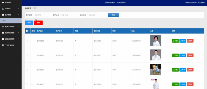 点击医护管理进入医护管理操作页面,管理员可以浏览系统已有的医护信息,并进行在线查询、新增、修改、删除医护信息等操作。医护管理界面如图5-3所示。