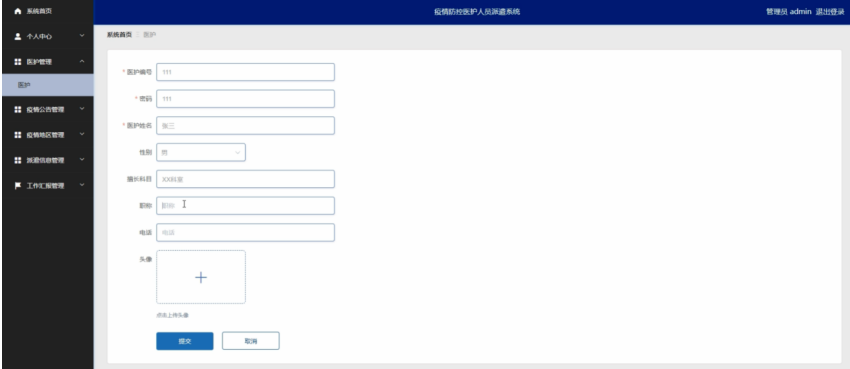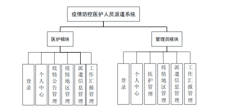 (1)功能要求:管理人员可以管理个人中心、医护管理、疫情公告管理、疫情地区管理、派遣信息管理、工作汇报管理等功能模块[3]。