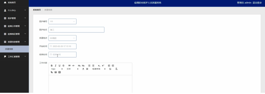 医护人员派遣管理:根据疫情地区的需要,系统可以安排医护人员的派遣任务,包括派遣地点、派遣时间、工作内容等详细信息的记录和管理。
