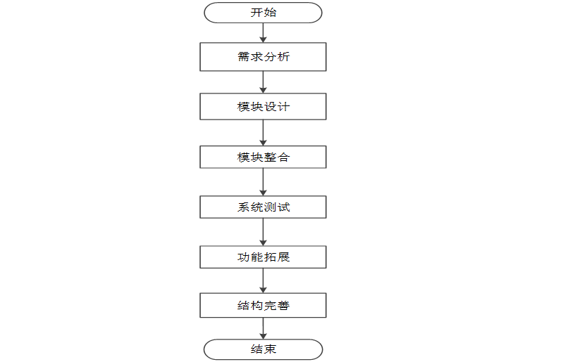 系统的开发流程设计简单的介绍了开发过程,先对任务书进行分析,根据要实现的功能对各个模块进行开发,之后再对模块一一进行测试,测试成功后将模块整合再测试整体功能,完善整体结构[6]。开发系统流程图如图4-3所示。